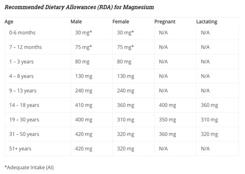 Most experts recommend a 2:1 calcium to magnesium ratio. In other words, if you take the recommended daily allowance (RDA) of 1,000 mg per day of calcium, you should take 500 mg per day of magnesium. Studies show that it is best to not consume more than 500 mg of calcium at a time, so split up your dose, or consume calcium in foods, which naturally spreads it out it up throughout the day.