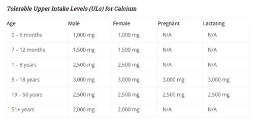 The Food and Nutrition Board established the tolerable upper limits for calcium listed below, but please be aware that these levels are not necessarily what is recommended or best for your health, given the scientific research linking excess calcium supplementation to cardiovascular conditions.
