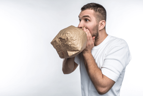 Never use a plastic bag as it can cause suffocation. Always use a paper bag that is about 6 by 15 centimeters. If it’s too small or too big, it won’t work. Place the paper bag over your nose and mouth and hold it with your hands as you breathe into it. The CO2 will build up in the bag, increasing your CO2 levels as you breathe in.