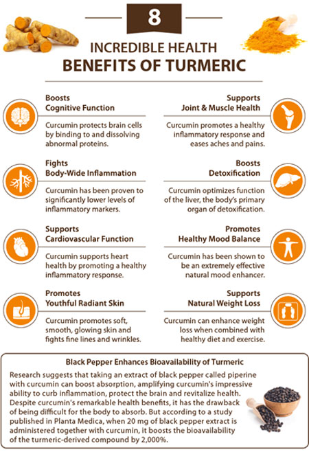 2. Absorption: One problem with curcumin is that it’s not easily absorbed. However, it was discovered that an extract of black pepper, called piperine, significantly enhances absorption of curcumin. In fact, one study found that the addition of a piperine increased bioavailablity by 2,000%! So make sure that any curcumin supplement you take contains this important extract.