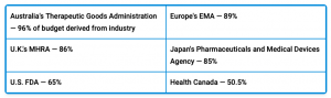 If there were ever any doubt that regulatory agencies are captured by industry, consider that significant portions of regulatory agencies’ budgets come from the pharmaceutical industry that these agencies are supposed to regulate. For instance:31