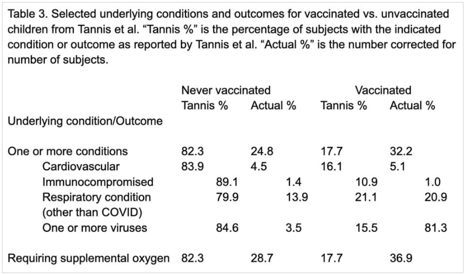 Instead of presenting the number of subjects experiencing the indicated outcome as a percentage of vaccinated or unvaccinated groups, they reported them as a percentage of all subjects experiencing that outcome. Since there were 7 times as many unvaccinated as vaccinated subjects, this approach all but guaranteed the numbers among the unvaxed would be higher.
