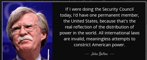 However, the report grimly details, in April President Donald Trump placed into power John Bolton as his National Security Adviser, whose hostility to the United Nations and the very idea of international law he previously declared by stating: “It is a big mistake for us to grant any validity to international law even when it may seem in our short-term interest to do so – because over the long term, the goal of those who think that international law really means anything are those who want to constrain the United States.”