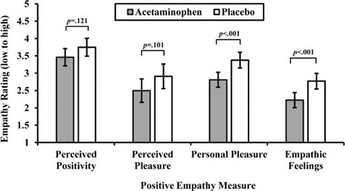 Below is a graph of the relative responses between Tylenol-treated and placebo-treated individuals, with the Tylenol group clearly seeing reductions in positive empathic responsiveness: