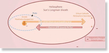 Like most celestial bodies, the Sun has its own Langmuir sheath, which extends almost 100 au (100 times the Sun-Earth distance) outwards. It’s also called the ‘heliosphere’. Electrically, the Sun-heliosphere couple acts like a giant condenser; the Sun being the positive electrode (anode) and the internal surface of the heliosphere being the negative electrode (cathode). Objects (comets, planets etc.) in the heliosphere can trigger electrical discharges from the sun (solar flares, sunspots, CMEs, etc.