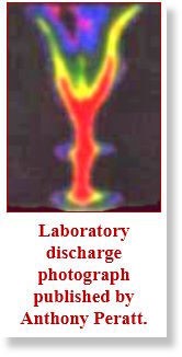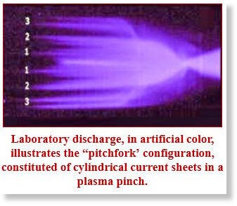 The simulation in the image above shows the cross-section of two plasma filaments joining in what is called a z-pinch; The filaments start out at the equivalent of 300,000 light years apart and carry Birkeland currents of 1018 amps. The simulations also showed emerging jets of material from the central buffer region, which resembles that observed from quasars and active galactic nuclei, which are attributed to ‘black holes’ according to Einsteinian physics.