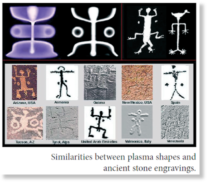 A discovery that the basic petroglyph morphologies are the same as those recorded in extremely high-energy-density discharges has opened up a means to unravel the origin of these apparently crude, misdrawn, and jumbled figures found in uncounted numbers around the earth. Drawn in heteromac style, these ancient patterns could mimic and replicate high-energy phenomena that would be recorded on a nonerasable plasma display screen. Many petroglyphs, apparently recorded several millennia ago, have a plasma discharge or instability counterpart, some on a one-to-one or overlay basis. More striking is that the images recorded on rock are the only images found in extreme energy density experiments; no other morphology types or patterns are observed.” (Peratt (2003), Characteristics for the Occurrence of a High-Current, Z-Pinch aurora) as Recorded in Antiquity)