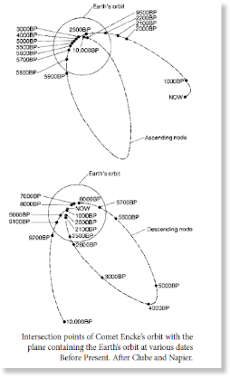 In the figure above, we see various nodes of important intersections between the orbit of comet Encke and the plane of the earth’s orbit. These approximate dates match the scientific data obtained from the Earth itself. The ancient traditions of the ‘end of the World’, (yes, many ‘worlds’ have ended throughout history), the Egyptian intermediate periods, the collapse of the Bronze age, the end of the Roman Empire, and more, all have to be re-examined with the inclusion of the scientific data based on astronomical observations and back-engineering of the data thus obtained.