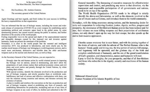 Iranian President Mahmoud-Ahmadinejad wrote it in a letter sent to the UN Secretary-