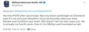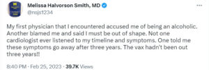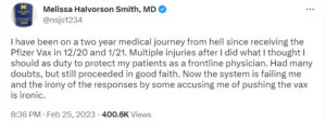 Dr. Melissa Halvorson Smith is a gynecologist from North Dakota and heads the Women’s Health Center. She was injured by 2 doses of Pfizer covid-19 mRNA vaccine. In her words (here):