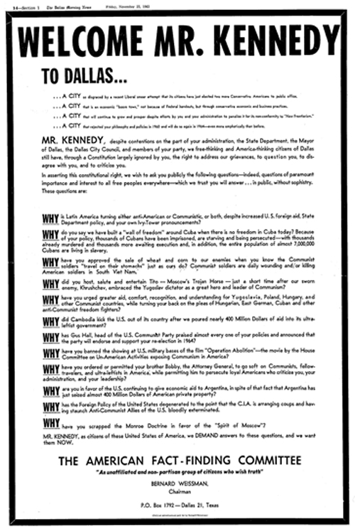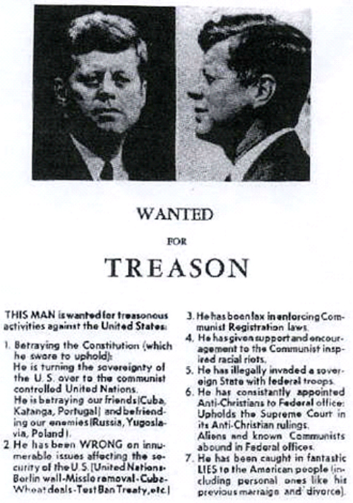 The Zionist mob that killed JFK, led by David Ben-Gurion, his Lansky-mob associates, and their assets in the CIA starting with Israeli mole James Jesus Angleton, set up “angry Cubans” and more pertinently “right-wing American patriots” as the most obvious suspects to anyone who didn’t buy the ridiculous official “Oswald acted alone” myth. That was the purpose of the above-pictured ads. (Seriously, folks… if right-wing patriot types were going to kill the president, would they have advertised it this way?)
