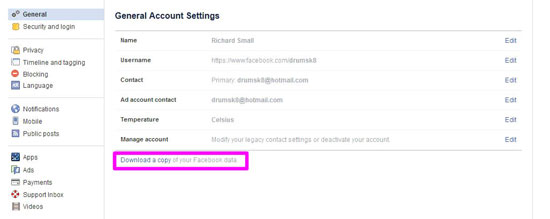 Whilst I was doing this I decided I would also download ALL my Facebook data that they are willing to tell me they have on me. To do this you would go back to the settings page following steps 1 & 2. From there you can see this little option: