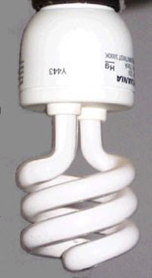 Compact fluorescent light bulbs are widely considered an environmental solution to replace the ubiquitous incandescent light bulb. Yet few consumers are aware that compact fluorescent bulbs have a noisy high voltage, high frequency circuit inside to trigger and maintain their glow. Since the operating frequency of these bulbs is below the AM radio band, there are no restrictions on the amount of electromagnetic radiation that they can generate. Manufacturers have strived to make the lowest cost bulbs using unshielded circuits that generate very high field levels. An example of a compact fluorescent bulb is shown in figure 2a. Figure 2b shows that the field strength within one inch of the bulb is an incredible 100mW/cm2.