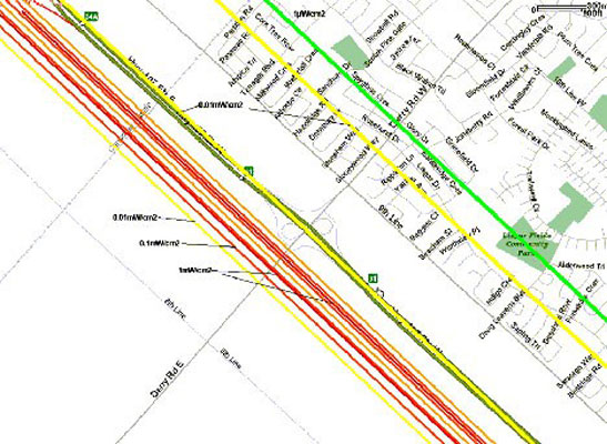 Figure 10bThe red lines are directly below the high tension wires. The radiation from AC power drops off very rapidly as you move away from the lines but levels off at 0.01mW/cm2 over highway 407 and the adjacent residential neighborhood. The green line, indicating a level of 1uW/cm2 begins at 1.5 km from the power lines.
