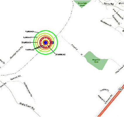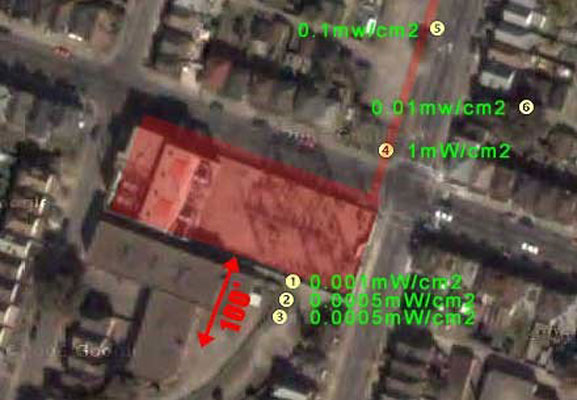 Figure 11b The residential neighborhood immediately to the right of the power lines drops off to 0.01mW/cm2 by the time it reaches the rear of the backyards. Properties close to high tension lines and cell towers will increasingly be perceived as hazardous and consequently have a lower property value.