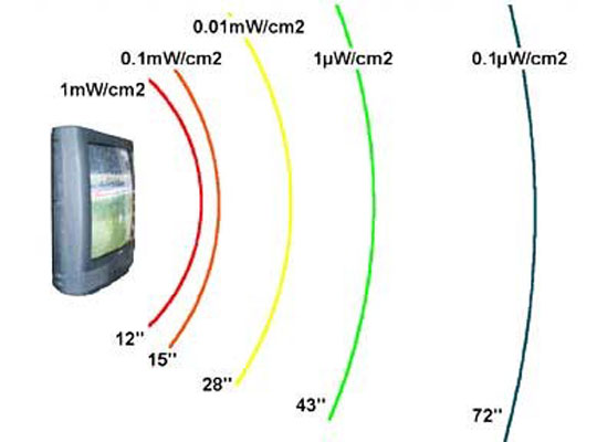 In Figure 3 the 27 inch TV has a high electromagnetic radiation emission in the first 12 to 15 inch from the front of the screen. The safe watching distance is beyond the lime green line at 43 inch (approximately 110 cm).