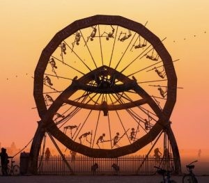 However, that’s not all—Nantes also hosts Charon’s Wheel, a creation of the American artist Peter Hudson. The work in question is a gigantic wheel in the shape of an eye, with a triangular base—which forms a triangle around the wheel, referring to the deist and Masonic symbol of the eye of providence—around which twenty skeletons wave and hang. The name “Charon” refers of course to the boatman who, in Greek mythology, leads souls to the Underworld by making them cross the Styx. After Nantes, Charon’s Wheel of Hell will be exhibited in Paris.
