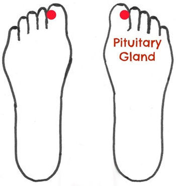 Pituitary Gland: The pituitary gland is the primary endocrine gland and controls almost every other gland in our body. It is located on the inside of the big toe (as illustrated in the diagram) and is often tender. Working on the pituitary gland encourages chemical and hormonal balance throughout the body and can be especially useful for the symptoms of PMT.