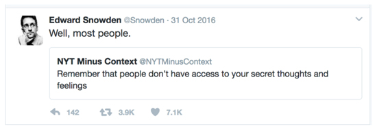 On October 31, 2016, Edward Snowden retweeted a tweet from NYT Minus Context that said “Remember that people don’t have access to your secret thoughts and feelings.” His tweet was a response to massive global surveillance, and the fact that nobody really has any privacy anymore. NWY Minus Context was trying to remind people that not everything can be under the watchful eye of the NSA. The thing that’s confusing is the fact that along with Snowden’s retweet, he responded with, “Well, most people.” See below: