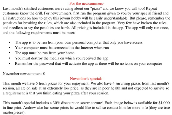The following text from the image, if it is proven true, would be extremely condemning in a criminal investigation: “This month we have five fresh pizzas for your enjoyment. We also have four surviving pizzas from last month’s session.