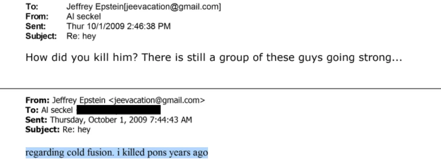 A previously unreported email exchange in the published federal Epstein file shows how Jeffrey Epstein personally boasts about having ended Stanley Pons’ cold fusion research – and describes the specific political mechanism by which he claims to have done so.
