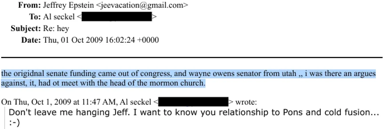 3. That Epstein had to meet with the head of the Mormon Church – almost certainly because BYU’s institutional involvement in the cold fusion dispute was routed through the LDS Church’s governance of the university.