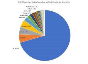 For example, the US represents around 70% of the entire annual combined defense spending of NATO countries. No other nation comes close.