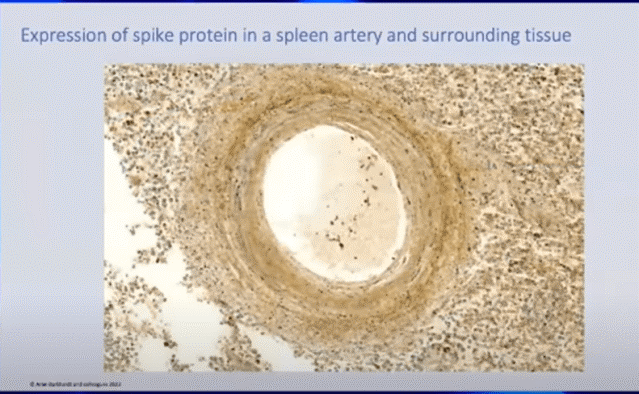 As an example of how prolific the spike protein can become once it gets into a tissue, Dr. Cole showed an image of a sample taken from the spleen. The big circle in the image below is an artery. All the brown dots are spike protein.