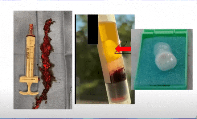The clots in the image below are from living patients. So, these thick fibrous clots, in the process of forming, are being found in living patients as well as being found by embalmers. The image in the middle is a blood sample taken from a patient in Germany who had been injected with three covid “vaccine” doses. After the sample was taken it began to form fibrils. So, the researchers “spun it down” and the clump in the image on the right came out. The clump is made of the same components as the fibrous clots.