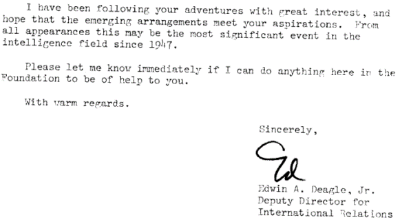 But declassified documents, released via Freedom of Information Act requests, reveal Deagle’s communication with the then United States Director of Central Intelligence, Stansfield Turner, proving a relationship existed with the top of the CIA.