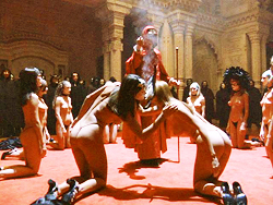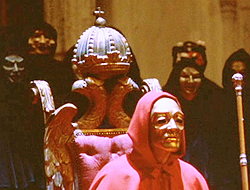 Harford finds out, due to the negligence of his friend, the piano player, that he is summoned to play, blindfolded, to some strange gatherings, which are kept each time in a different location and in which all the participants wear black capes with hoods and masks. Each time he is told a necessary password in order to be able to enter. Moreover, he tells him that last time the scarf was loose and he could see lots of women, all with the bodies of models, naked… The doctor assumed the required disguise and, using the password he knew from the piano player, he steps into the sumptuous castle, finding himself in full satanic sexual ritual, similar to black magician Aliester Crowley’s orgies. The mysterious woman warns him twice that by his presence there he’s putting his life in danger. Shortly after this he was caught as an intruder and the leader of the ritual (the “High Priest”) forced him to take off his mask and clothes. In this difficult moment for the doctor, the same masked woman, who is suggested to be Mandy, Ziegler’s stoned lover, offered to sacrifice herself in his place. As a confirmation of this “ritual sacrifice”, the following day newspapers announce the woman’s death from an overdose. By this, the director shows that any Monarch slave can be eliminated if she breaks the rules determined by the program and is considered a risk for the program.