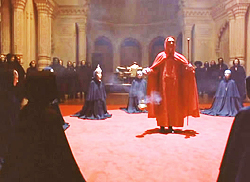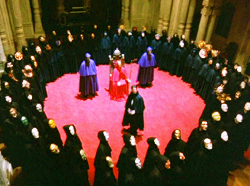 Back home, Bill and Alice are about to make love and they are smoking some “herbs” when Alice has a sudden jealousy crisis (thinking of Bill’s flirt with two models, at the party) and becomes angry – because she thought the men at the party had looked at her as a sexual object. With this occasion she confesses to Bill one of her erotic fantasies, with a marine officer she had seen at some hotel. The black and white images of the imaginary betrayal by his wife will accompany Doctor Harford throughout the entire movie. Sick with jealousy, a feeling he had never experienced before with Alice, he’s looking for a sexual adventure. He appeals to a prostitute, Domino, who turns out in the end to be infected with HIV, then, with the help of his friend, the piano player he had met at Ziegler’s party, he comes to witness a secret sexual ritual, which evokes the ceremonies of some occult organizations: the participants have to wear long capes with hoods and masks, everything is absolutely secret, and Bill is warned by a woman that he is in great danger. At the height of the irony, the password to access the ceremony, where everyone is copulating with each other, is “Fidelio” (meaning fidelity). Being exposed as an intruder, the doctor escapes from the orgy’s climax with the help of the masked woman who had previously warned him and who accepts “to sacrifice herself” for him.
