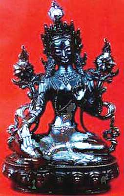 -The Green Tara (in Sanskrit: Syamatara, in Tibetan: Sgrol-ljang) is believed to have incarnated in the Nepalese princess. She became the Green Tara when she descended into the world of manifestation. She looks like a young playful girl while the White Tara is represented as a mature and wise woman. The Green Tara is the most gentle and sincere manifestation of Tara. It guides us in our ascent to enlightenment. Tara belongs to the Krama family, symbolized by its green color and she is the full of wisdom counterpart of the transcendental Amogasiddhi Buddha. She is described sitting on a lotus flower with her left leg placed over her right thigh, and her right leg hanging. Her left hand is placed on the heart with the palm out, her thumb and ring finger touching, and the other three fingers are pointing up making thus the mudra of protection. Her right hand rests on her right knee, with the palm making the mudra of generosity..