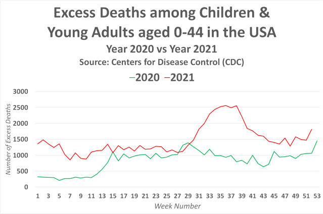 The following chart shows the official CDC figures for all deaths and excess deaths among children and young adults across the USA prior to the roll-out of the covid-19 vaccine, and after the roll-out of the covid-19 vaccines on the 14th Dec. 2020.