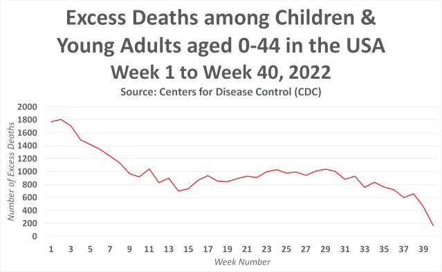 The data released by the CDC covers up to week 40, the week ending October 9th, and it should be noted that the last few weeks of data are subject to change. But as you can see from the above, 2022 has also been a significant year for excess deaths among children and young adults.