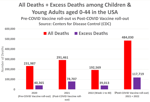 But the most concerning figures revealed in the above chart are the overall number of deaths and excess deaths among children and young adults since the roll-out of the covid-19 injections.