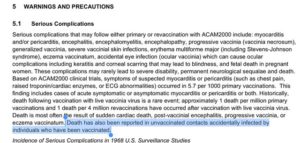 “Serious complications that may follow either primary or revaccination with ACAM2000 include: myocarditis and/or pericarditis, encephalitis, encephalomyelitis, encephalopathy, progressive vaccinia (vaccinia necrosum), generalized vaccinia, severe vaccinial skin infections, erythema multiforme major (including Stevens-Johnson syndrome), eczema vaccinatum, accidental eye infection (ocular vaccinia) which can cause ocular complications including keratitis and corneal scarring that may lead to blindness, and fetal death in pregnant women.