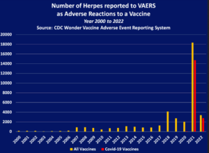 The following chart shows the number of herpes infections/complications that have been reported to VAERS as adverse reactions to all vaccines (including the covid jabs) by the year reported, and the covid vaccines only by the year reported.
