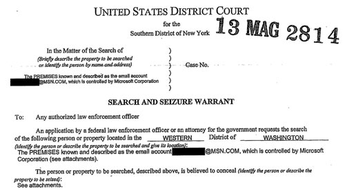 “An application by a federal law enforcement officer or an attorney for the government requests the search of the following… property located in the Western District of Washington, the premises known and described as the email account [REDACTED]@MSN.COM, which is controlled by Microsoft Corporation.”