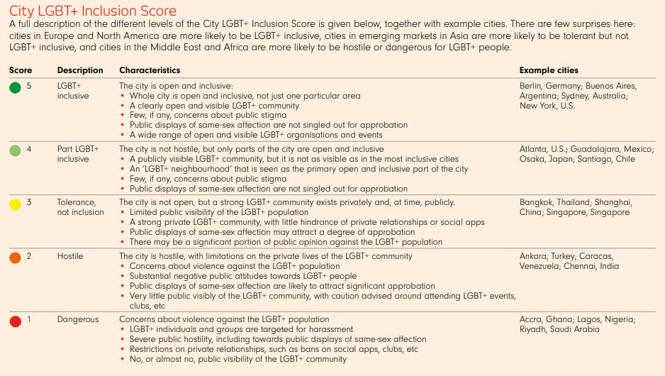 The report offers a scoring system for cities, an Inclusion Score from 1 to 5: