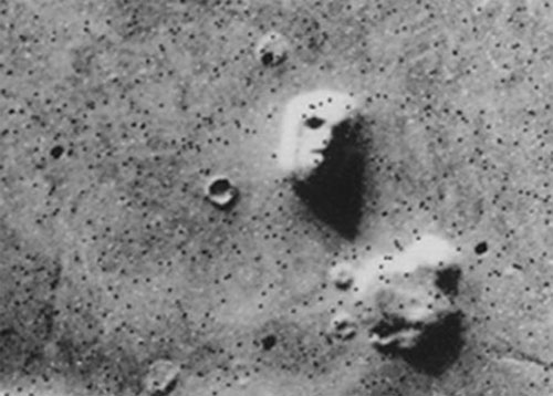 Another researcher, Greg Orme, has found in the Mars Global Surveyor archive a “Crowned Face”. It is perhaps 11 miles wide and situated near Syrtis Mayor. All these images were already photographed by Mariner 9 and Viking 1 and later published in several scientific books in the last years, and in several newspaper articles in Germany and Austria during 1979 and 1981.
