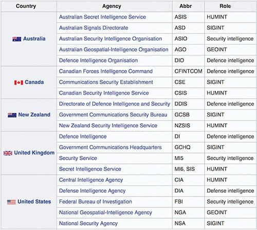 The Five Eyes alliance agencies include, but are not limited to, the US’s NSA and CIA, the UK’s Government Communications Headquarters (GCHQ), Canada’s Communications Security Establishment Canada (CSEC), the Australian Signals Directorate (ASD), and New Zealand’s Government Communications Security Bureau (GCSB).