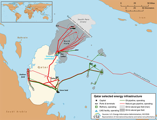The reasons for gas as the source of discord are numerous and start in 1995 “when the tiny desert peninsula was about to make its first shipment of liquid natural gas from the world’s largest reservoir. The offshore North Field, which provides virtually all of Qatar’s gas, is shared with Iran, Saudi Arabia’s hated rival.”