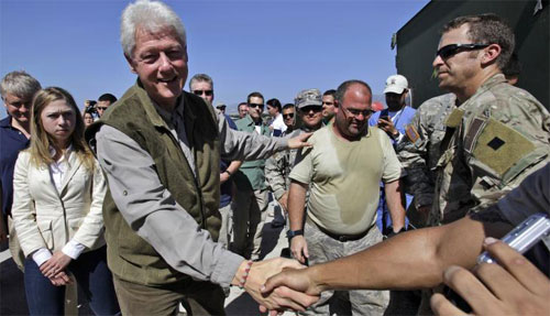 Former president and U.N. special envoy for Haiti, Bill Clinton, second from left, shakes hands with soldiers of the Joint Task Force-Haiti in Port-au-Prince, Monday, Jan. 18, 2010. Clinton promised that his foundation would provide medicine and a generator to the capital’s General Hospital in order to support doctors there work through the night. At left, Clinton’s daughter Chelsea Clinton.