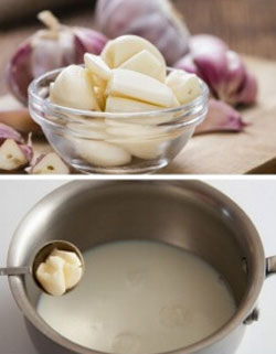 Mix the water and milk in a pot, add garlic to the heating mixture.