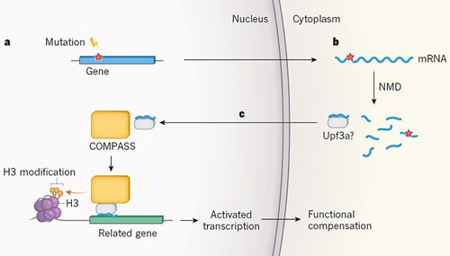 An intriguing discovery made by Ma et al. is that NITC requires the upf3a protein, an enigmatic NMD factor that was previously shown to either repress or modestly promote NMD, depending on the mRNA targeted for degradation. The authors found that upf3a interacts with several components of the COMPASS complex, and increases H3K4me3 occupancy at the promoter regions of upregulated paralogue genes. These findings led Ma et al. to propose that upf3a recruits the COMPASS complex to gene-paralogue promoters to generate the H3K4me3 mark responsible for activating gene transcription.