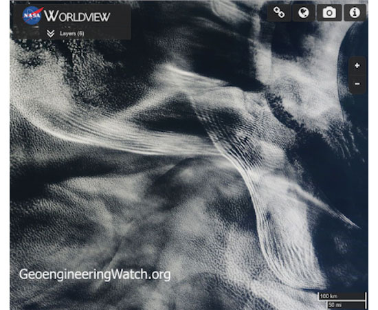 The combination satellite/radar image shown below clearly reveals the climate engineering scenarios described in this article. The brighter the cloud cover is, the more aerosolized it is. “Cloud albedo enhancement” (CAE) is a component of climate engineering/SRM. Though official sources would have us believe that CAE processes are only a “proposal” for marine cloud formations that would be created with ship emissions, the ongoing jet aircraft aerosol dispersions in our skies are undeniable. The overall result of solar radiation management is vast areas of largely rainless cloud cover that blots out our once blue skies.