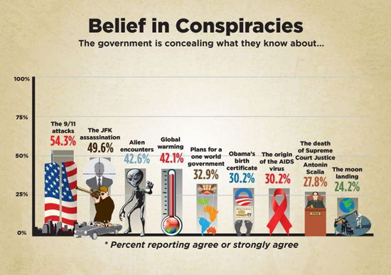 Results showed that a solid minority of people who not only believed in conspiracies involving the 9/11 attacks, but also held conspiracy theories about President Obama’s birth certificate and the origin of the AIDS virus. Nearly a fourth found something suspicious in the death of Supreme Court Justice Antonin Scalia.