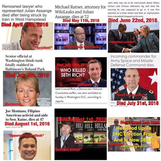 The Clinton conspiracy list depicting deaths, murders, allegedly staged suicides, and hits ordered by the Clintons is vast. In August 2016, when there were three deaths in the month, with two in one week, many conspiracy theorists are asking if there is a media blackout regarding coverage for those who have recently passed away, died or committed suicide.