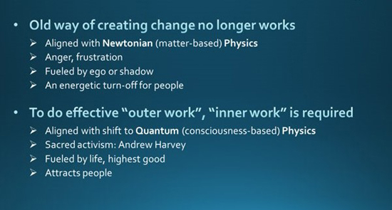 It is increasingly clear that coming from love is necessary if we want to see real and lasting change. When we act from frustration, anger, or ego, it pushes away what we want, and usually the problem is either the same or worse. As counterintuitive as this may be to old-world thinking, as annoying as it is when we’re pissed off about whatever corrupt agenda, the dynamic seems to be real.